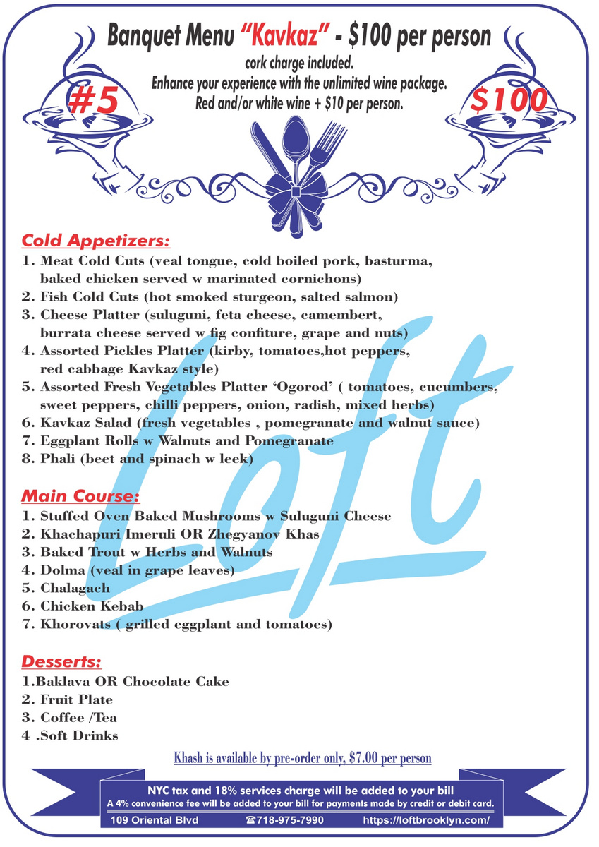 Banquet Menu “Kavkaz” – $90 per person cork charge included. Enhance your experience with the unlimited wine package. Red and/or white wine + $10 per person.