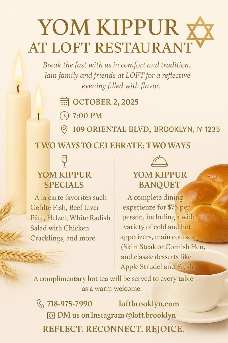 🍽️ Yom Kippur Banquet – A complete dining experience for $75 per person, including a wide variety of cold and hot appetizers, main courses (Skirt Steak or Cornish Hen), and classic desserts like Apple Strudel and Fresh Fruit. Complimentary coffee, tea, and soft drinks included.